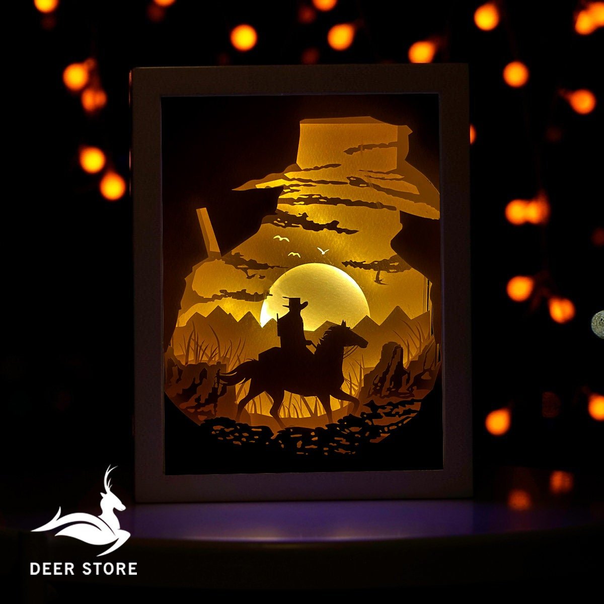 This design captures the cowboy spirit — the silhouette of a rider, the desert horizon, cactus landscapes, and Western motifs that instantly transport you to the prairies. When placed inside a light box and illuminated, the layers cast dramatic shadows, creating a 3D-like effect that feels alive.